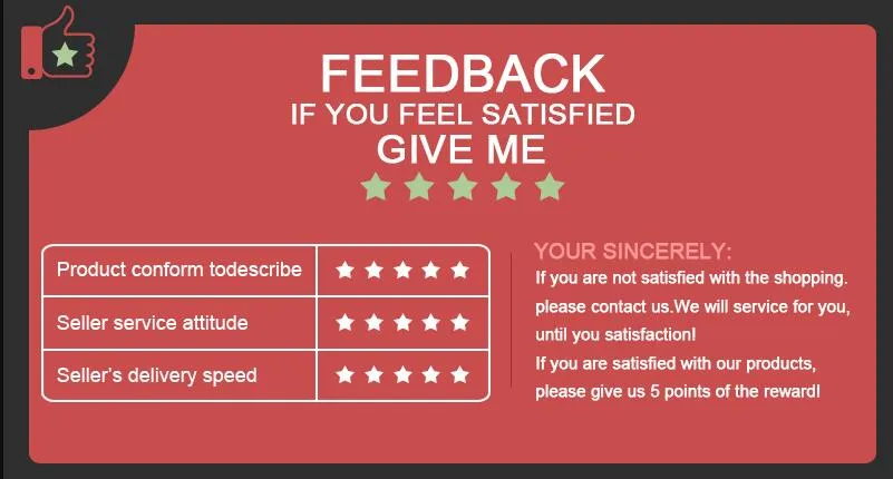 2. If you have any problem or are not entirely satisfied with your package,please donโt be hesitate to contact us first before leaving negative feedback. We will resolve the problem to satisfy you.